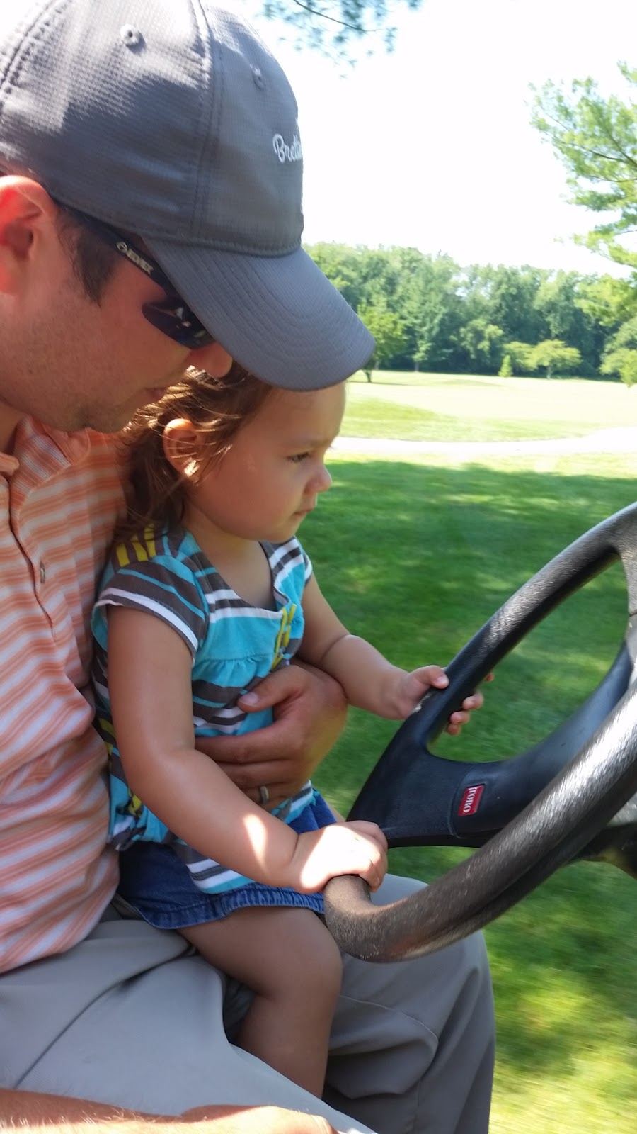 She doesn’t know how to pedal yet, but she’ll get there! We visit daddy at work every weekend, and she helps him drive the cart. She is loving her gymnastics class, so I’m sure we’ll be enrolling her in the fall/winter session as well!