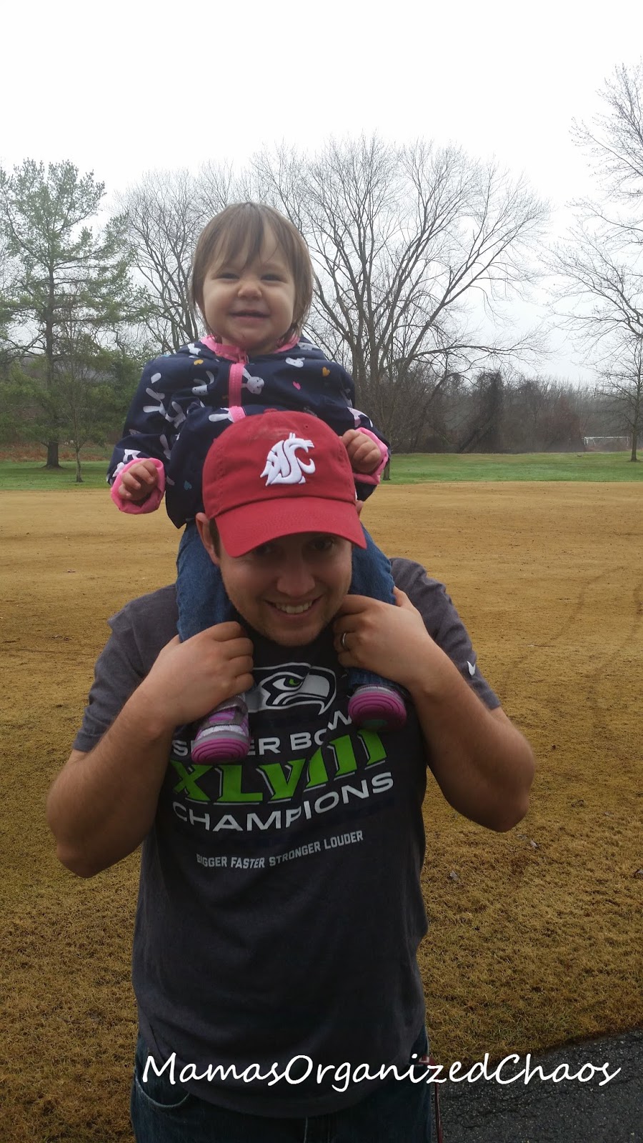 We started the day by eating breakfast with Daddy. It is very rare that we get to wake up with Daddy at home! When we do, you are always excited! We then took the dogs and went to the golf course and let them run around. This is our 2nd annual golf course visit, and we plan to continue for a long time. The golf course is quiet on Christmas morning, and we can have the place to ourselves (for the most part). This Christmas was a beautiful day. So nice, that we could wear short sleeves! Last year you were all bundled up in a carrier against Mama. This year, you were walking down the path on your own. You were splashing in puddles, looking at the tee markers, and simply having a blast!