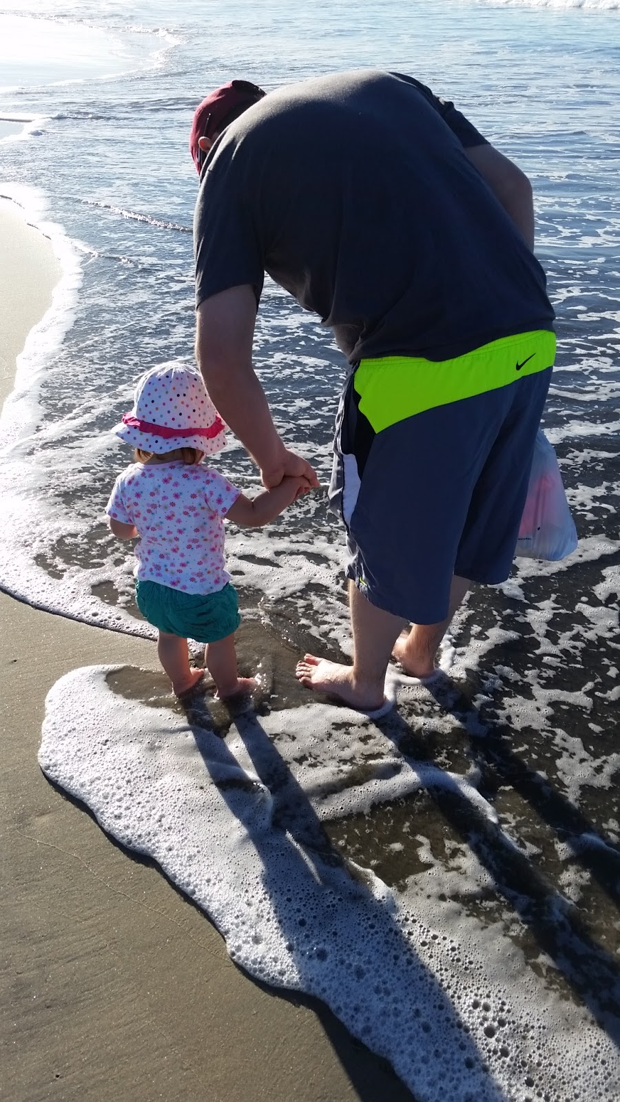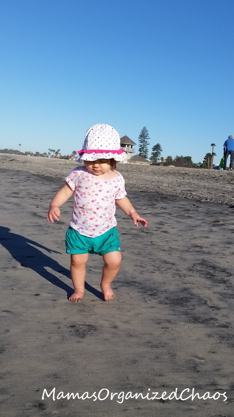 On Tuesday, after breakfast, Daddy and I took you out to Coronado Island to find the beach. As we walked towards the water we let you walk in the warm sand. You didn’t want to have anything to do with it at first and would climb up Daddy like a little monkey, but you kept putting your feet down towards the ground and we could see that you wanted to try it. You finally got up the courage and just did it. You laughed. We got down to the ocean and you were again a little hesitant. Mama and Daddy got our feet wet and encouraged you. It took you awhile, but soon you were pulling us out into the ocean for more fun. It was so cold, but you didn’t seem to mind.