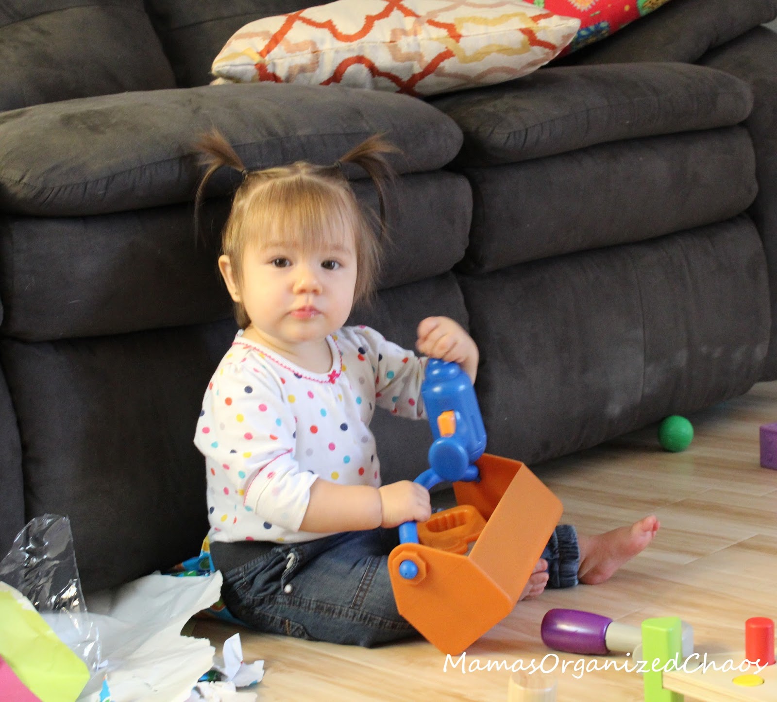 Daddy came home. He got to come home nice and early today since it was Thanksgiving. We got to spend the whole day with him! The first thing we did was let you open your birthday presents. You loved everything and had fun pulling the paper off. You stood right by my side the whole time, not holding onto anything. You are getting so strong and so good at balancing.