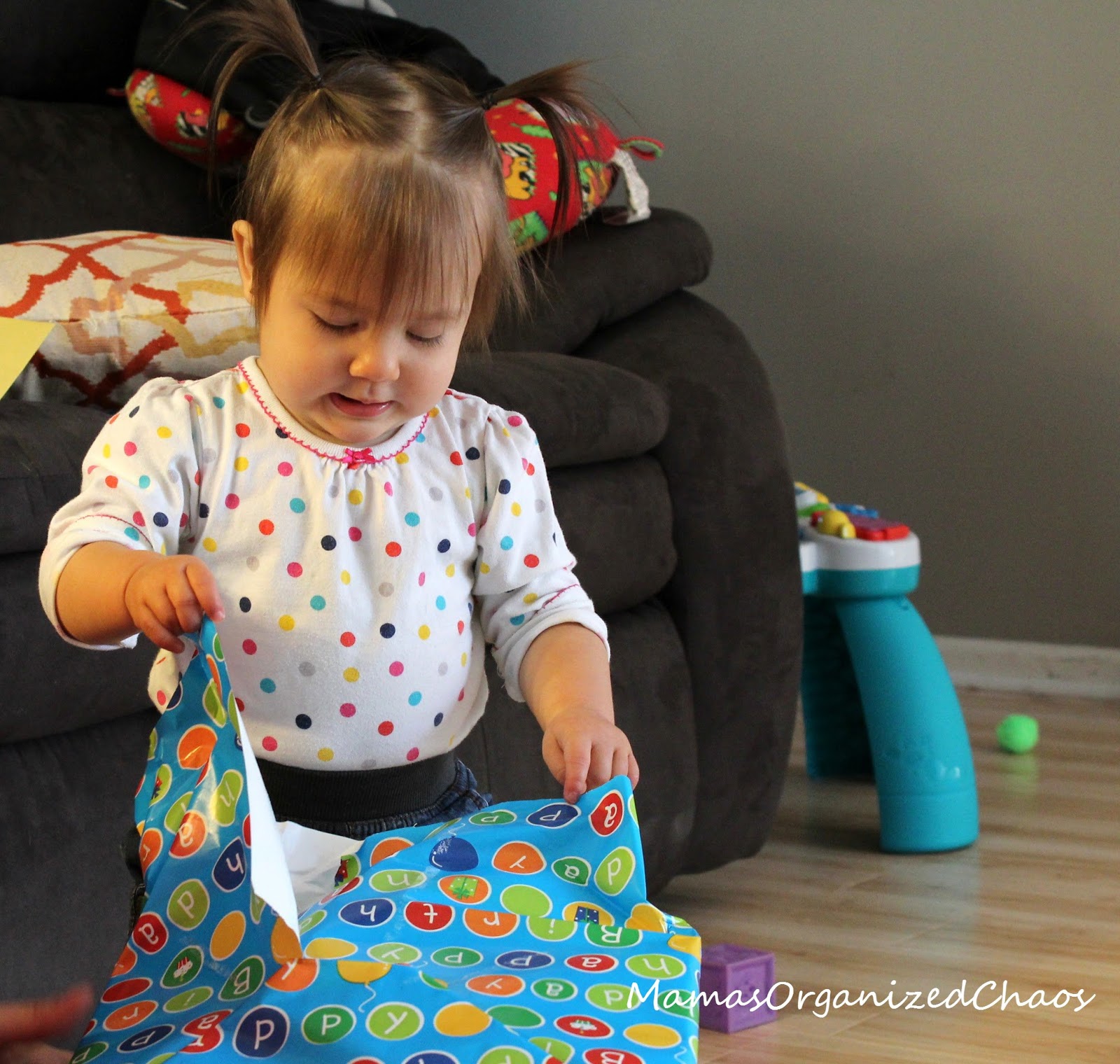 Today you woke up at 7 am as you always do. I came in with your warm milk. I sang happy birthday to you as I turned off your sound machine and opened up the curtains. You rolled around in your crib and snuggled with your blanket. I came to get you and you pointed for your milk. I held you in the glider as you drank. We then got you dressed and came downstairs.