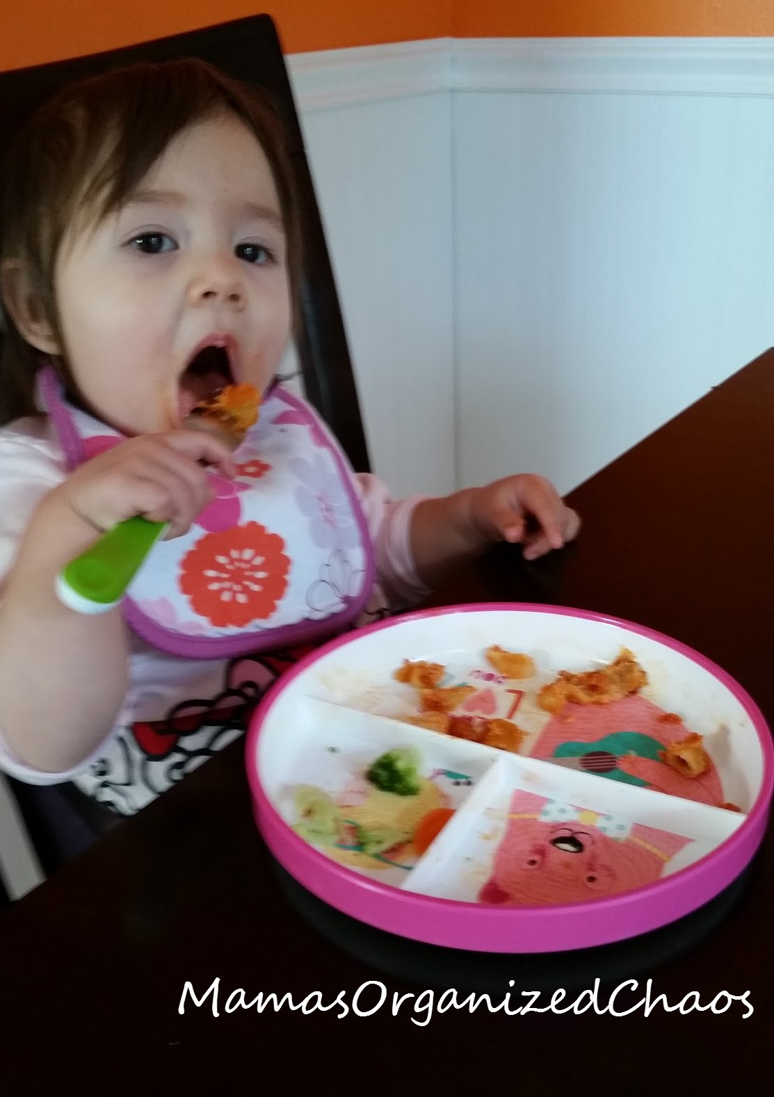 Caroline is just starting to really use a fork. We had purchased some pretty inexpensive plastic reusable forks that we loved. I have to say, once we tried the Oxo Tot fork, my mind was changed. A metal fork in general is much more conducive to them actually stabbing the food and being successful. The handle on this fork is nice and thick and gives Caroline a lot of control. Her fork using skills instantly improved just by giving her the right type of utensil to use!