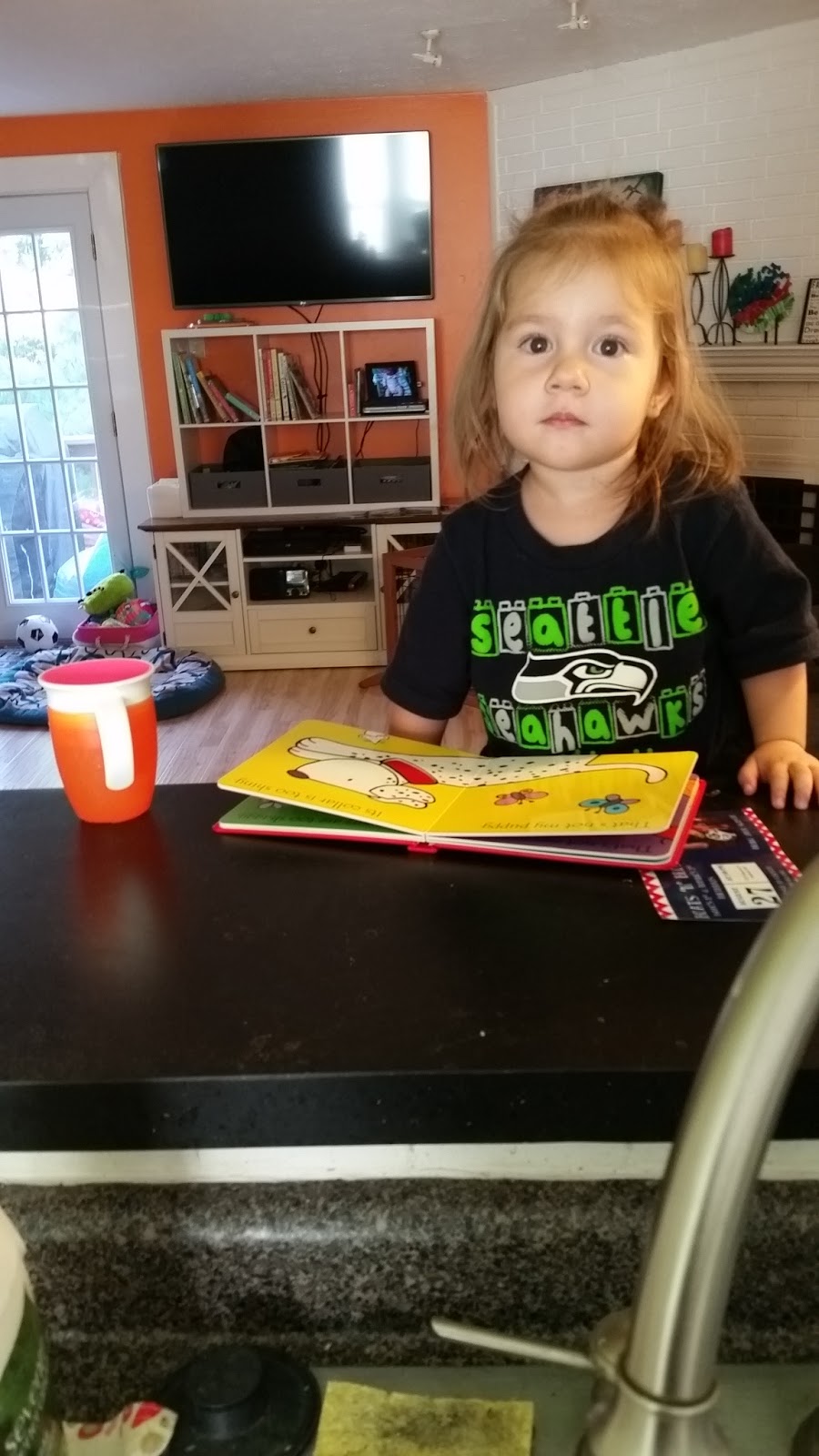 My daughter pops her head up, as she often does, in the pass through window between the family room and the kitchen. She’s climbed up on the couch and is talking to me, grabbing at the items on the ledge, and climbing further and further up. I remind her not to climb, but don’t bother to stop what I’m doing to physically go and stop her.
