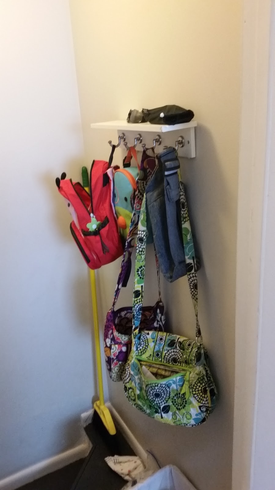 4. More hooks. For us, there isn’t really room for more hooks in the hallway. However, close by, we have the stairs that lead down to our basement level. Since it is hidden away nicely, and relatively close to the front door, I chose to place a set of hooks at the top of the stairs. These hooks house my purse, our daughter’s backpack and lunch box, and even give us a place for sunglasses.