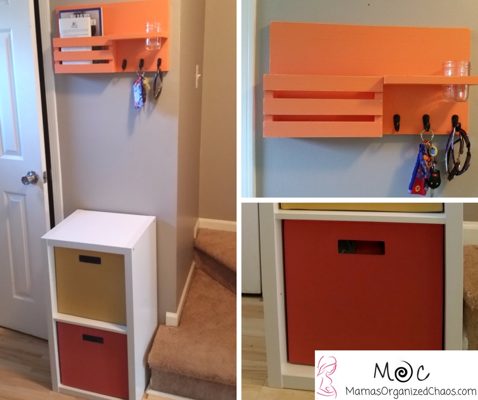 Utilizing all of these organization methods, we are able to have everything up off of the floor so our entryway is workable. Everything has a location (especially now that we have our latest addition- the mail/key holder)!