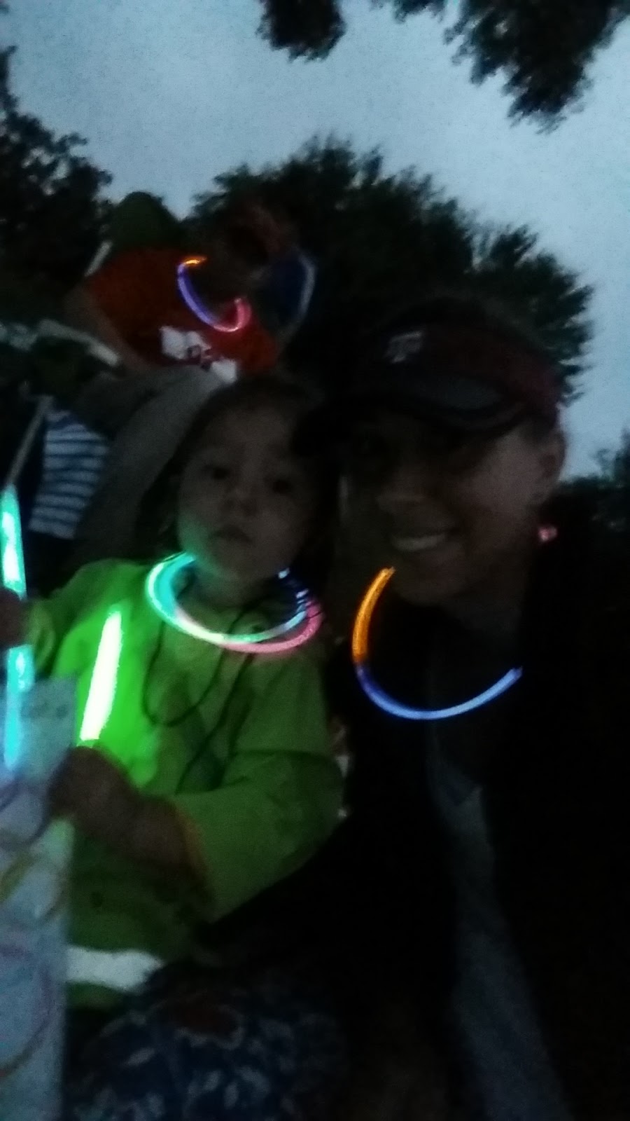 4 hours later, lots of snacking and playing had been done. People finally started showing up for the fireworks. We grabbed a spot closer in and got out the glow sticks to play with. Caroline had a blast putting her glow necklaces on and off. So much so, she wasn’t really interested in the fireworks! She looked every once in awhile, and pointed a few times, but all in all she was more interested in the glow sticks! I could occasionally get her attention towards the fireworks if I’d mention to look for a certain color. Even still, we all had a great time.