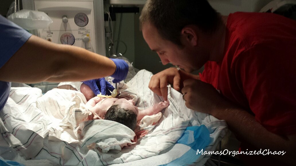 They placed Caroline on my chest and my mom got to cut the cord. They took Caroline over to clean her up and Daddy went with her. I watched Caroline as they stitched me up (I had a second degree tear). I didn’t tear until the last push. I saw and felt it happen! I watched as my husband became a dad.