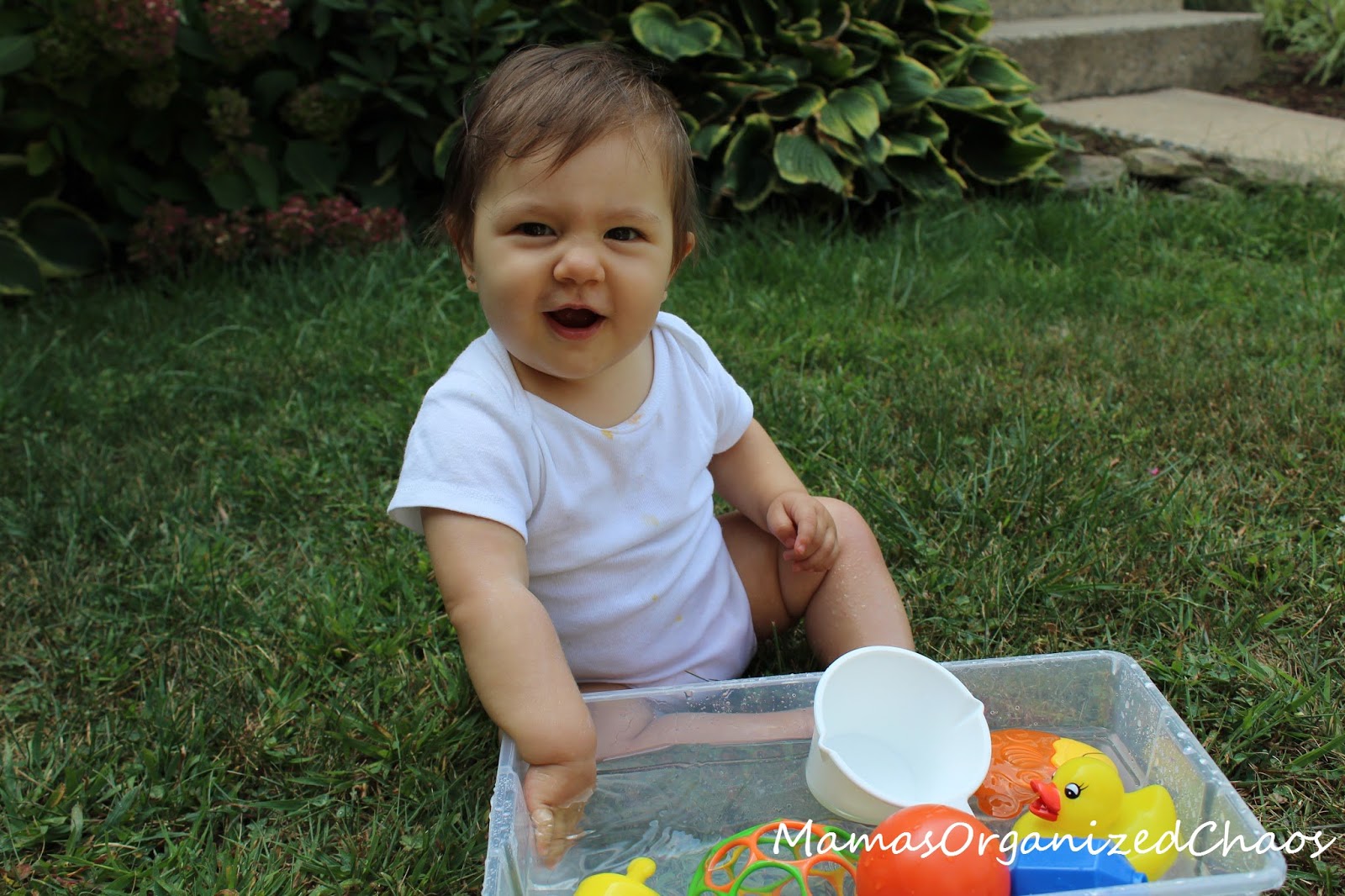 Caroline loved this activity! I took her outside and filled a plastic bin with water and toys. I just used what we had in the house. I gave her a few toys that would squirt water, some that would float, others that would sink, and a couple that she could fill with water and dump the water out. She ended up ignoring most of the toys, and just splashing in the water. She loved watching the water move.
